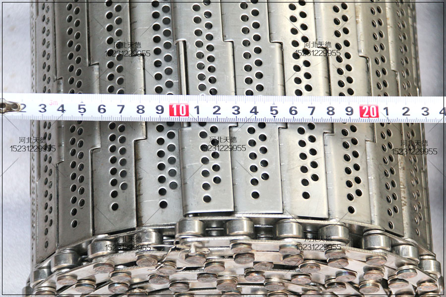 鏈板輸送帶是采用鏈條與板材加工成的,總寬度是70公分,長度是10米,食品輸送機的傳送距離是5米,板厚采用1.5毫米不銹鋼304材質(zhì)的板材加工的,鏈條節(jié)距為50.8毫米的,桿直徑選擇為10毫米的。