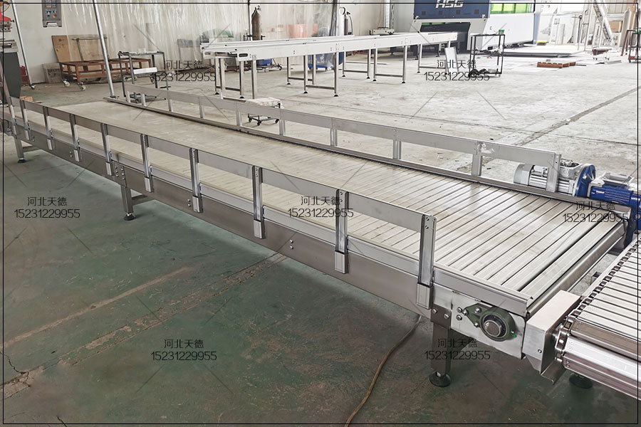 鏈板輸送機(jī)是用于食品、罐頭、化妝品與紙制品、調(diào)味品、乳業(yè)的主動(dòng)輸送、調(diào)配跟后道包裝的連線輸送。鏈板輸送機(jī)能滿意各個(gè)飲料貼標(biāo) , 灌裝、蕩滌等輸送設(shè)備的單列輸送請(qǐng)求,同樣也可能由單列變成多列并且行走緩慢,從而產(chǎn)生貯存量,滿意殺菌機(jī)、儲(chǔ)瓶臺(tái)、冷瓶機(jī)的大量供料的 請(qǐng)求,可能將兩條鏈板輸送機(jī)的頭尾部做成重疊式的混淆鏈,使得瓶(罐)體處于動(dòng)態(tài)適度狀況,使得輸送線上不滯留瓶子,可能實(shí)現(xiàn)空瓶與實(shí)瓶的壓力跟無(wú)壓力輸送。