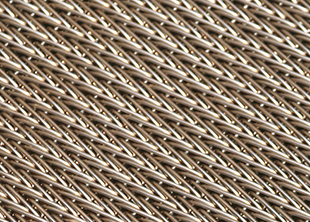 人字形網(wǎng)帶是雙旋網(wǎng)帶的一種變體,依此由左旋和右旋網(wǎng)條形成非常緊密和平整的網(wǎng)面。通常使用直軸。網(wǎng)帶的緊密性使這種網(wǎng)帶很適合輸送小件產(chǎn)品,例如堅果、螺栓、螺釘、釘子、小甜餅化式顆粒等。
