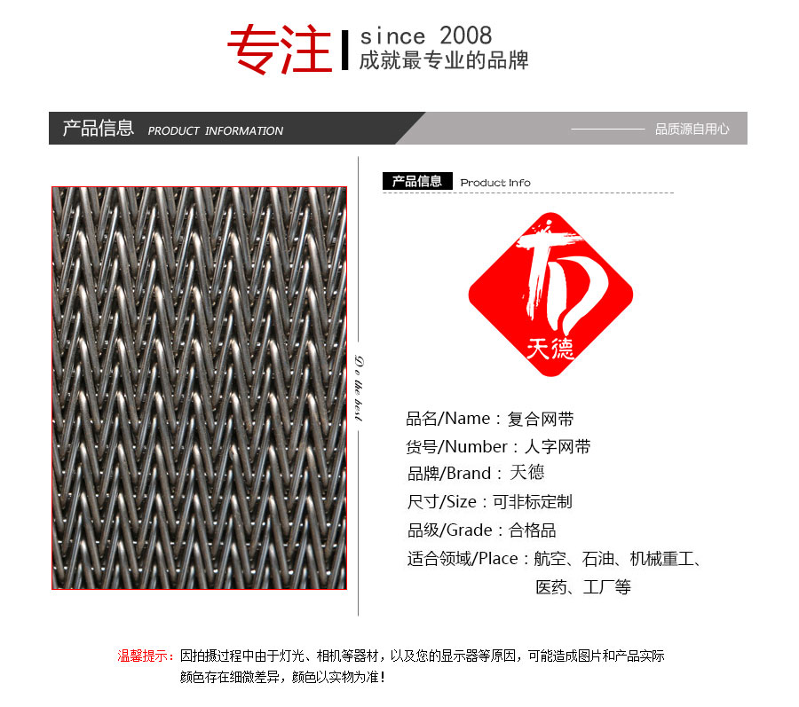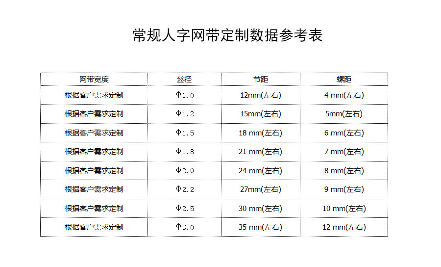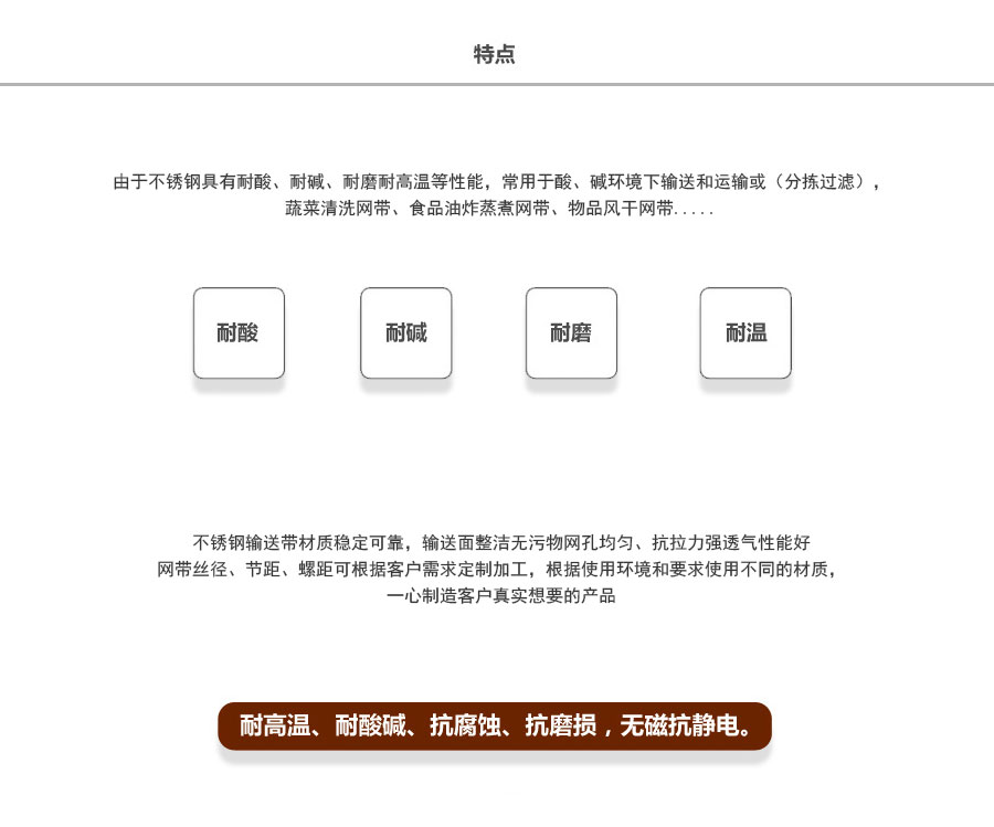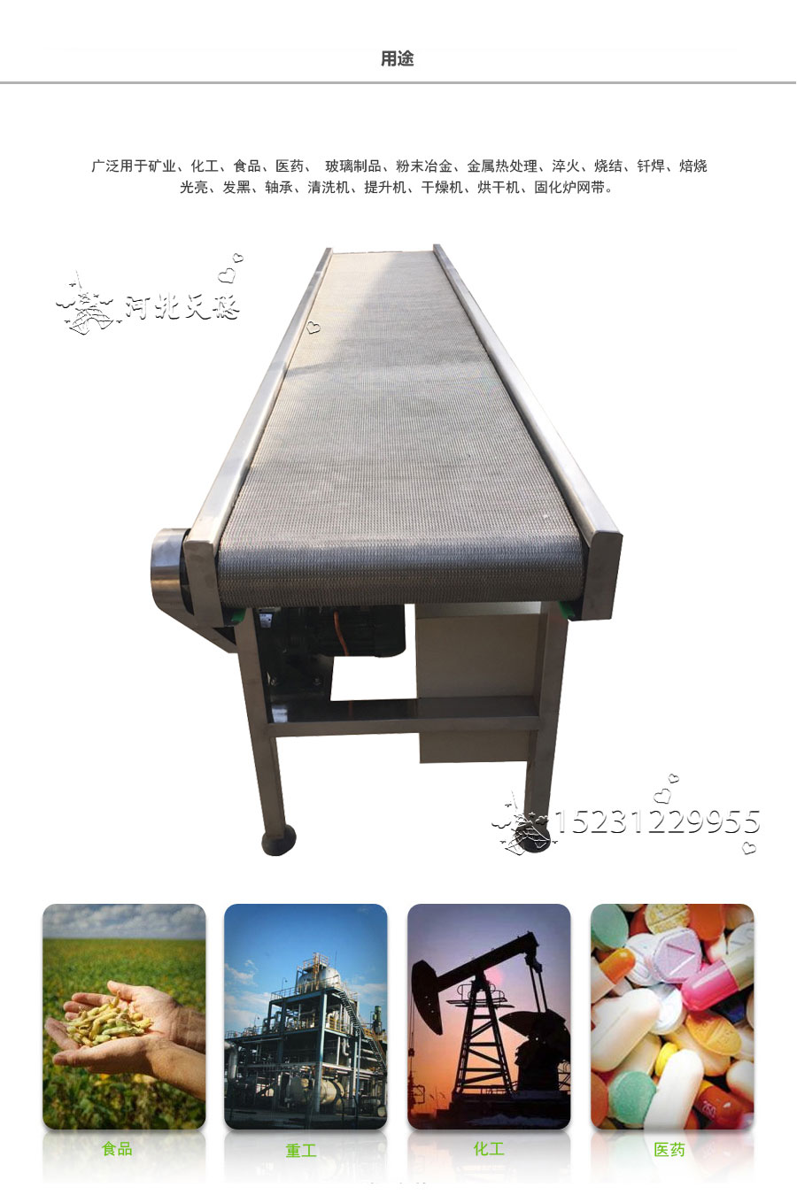 人字形網(wǎng)帶應用:主要應用于食品烘干機、蔬菜、海產(chǎn)品清洗機,巴氏機,方便面米粉蒸煮、熱收縮膜包裝機。玻璃瓶罐、食品、燈炮、金屬、器皿、化纖、印染、醫(yī)藥、電子、粉末冶金、熱處理、木材、物流輸送等各行業(yè)自動裝置和自動流水線的使用;焦爐煤氣及電子紅外線等各種窯爐系統(tǒng)的傳動使用等食品機械,玻璃機械,輸送機械。