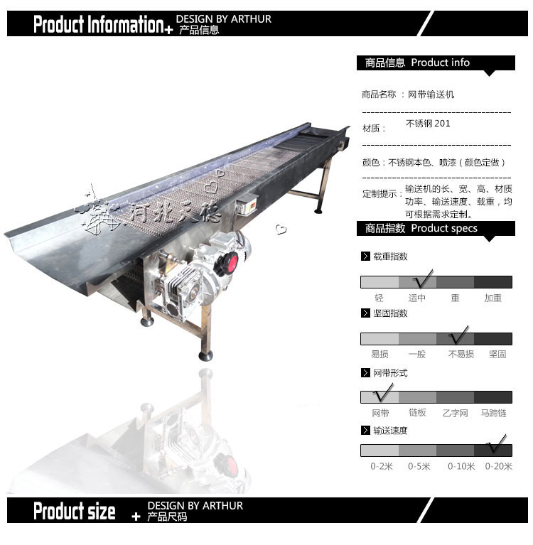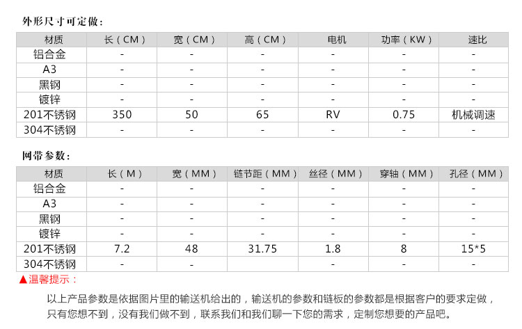適用范圍:廣泛應用于飲料瓶、鋁罐、藥品、化妝品、食品等行業(yè)的輸送,通過選用不同的網帶可以制作成儲瓶臺、提升機、殺 菌 機、蔬菜清洗機、以及肉食品輸送等行業(yè)專用設備。考慮網帶承受拉力限 制,單線長度一般不超過20米。