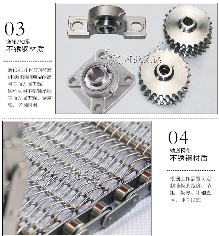 網(wǎng)帶材質(zhì): 碳鋼、201不銹鋼、304不銹鋼(某些帶型符合FDA、USDA標準,因此廣泛用于食品加工業(yè)。)