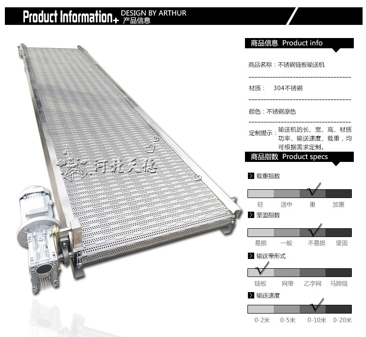 應(yīng)用行業(yè)有:食品加工、速凍加工、設(shè)備組裝、金屬件輸送、機(jī)床排屑,況且在這些行業(yè)中對(duì)鏈板輸送機(jī)的使用型號(hào)也不一樣。平頂鏈板式輸送機(jī)適合高速輕型產(chǎn)品輸送機(jī);折彎鏈板式輸送機(jī)適合重型、體積大產(chǎn)品輸送;合頁(yè)鏈板式輸送機(jī)適合稍重、細(xì)小產(chǎn)品輸送。大家在購(gòu)買時(shí)一定注意要根據(jù)自己產(chǎn)品來選型。